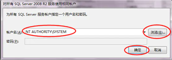 服务器配置,按照如图配置一样的账户名,点击下一步。(下图中启动类型,可根据需要设置成手动或者自动,对于本系统,全部设置成手动即可)。